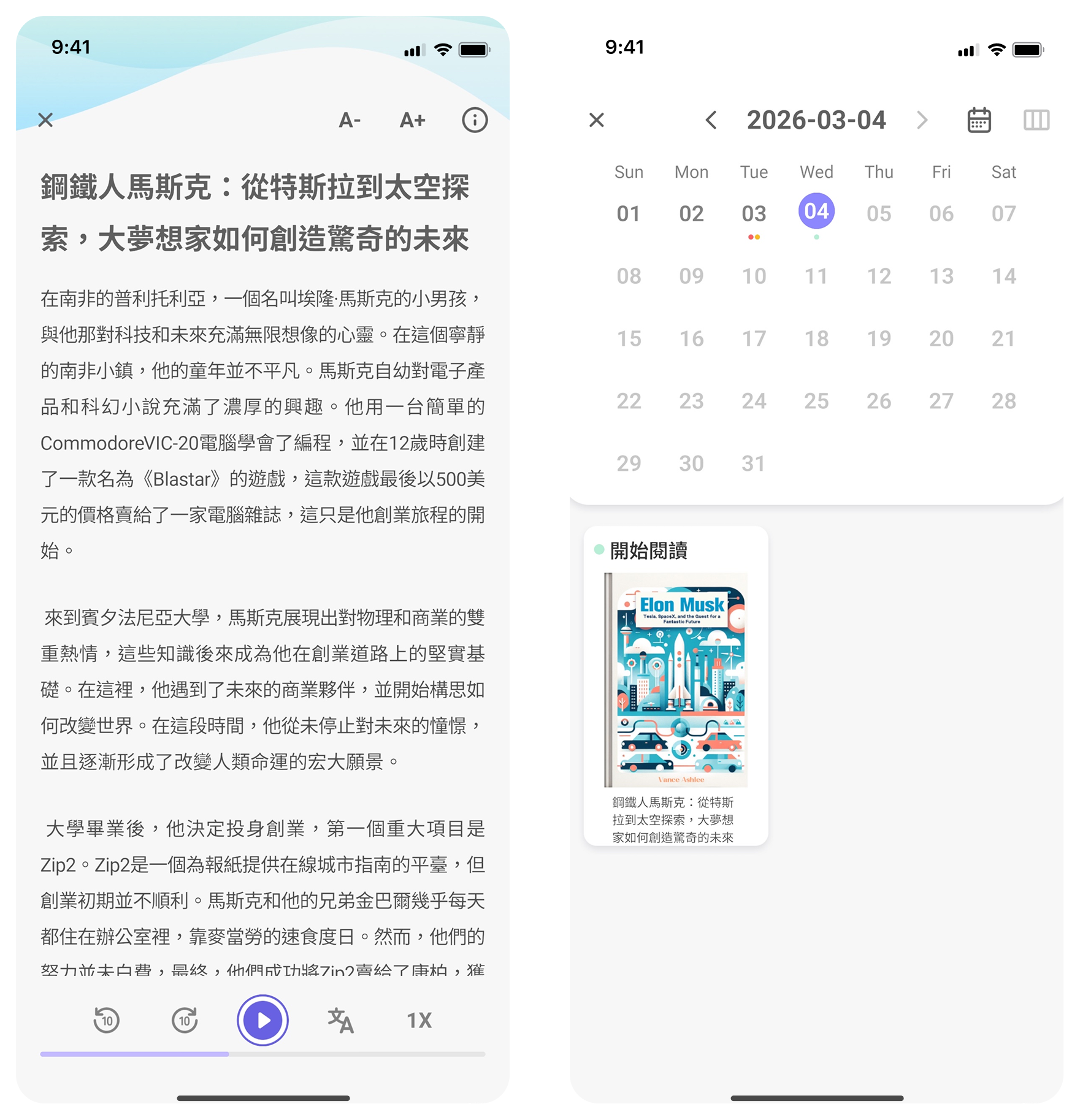 獨家結合個人行事曆功能,為你規劃閱讀排程,讓語言學習與知識擴充同步並行,打造最有感的高效閱讀生活。