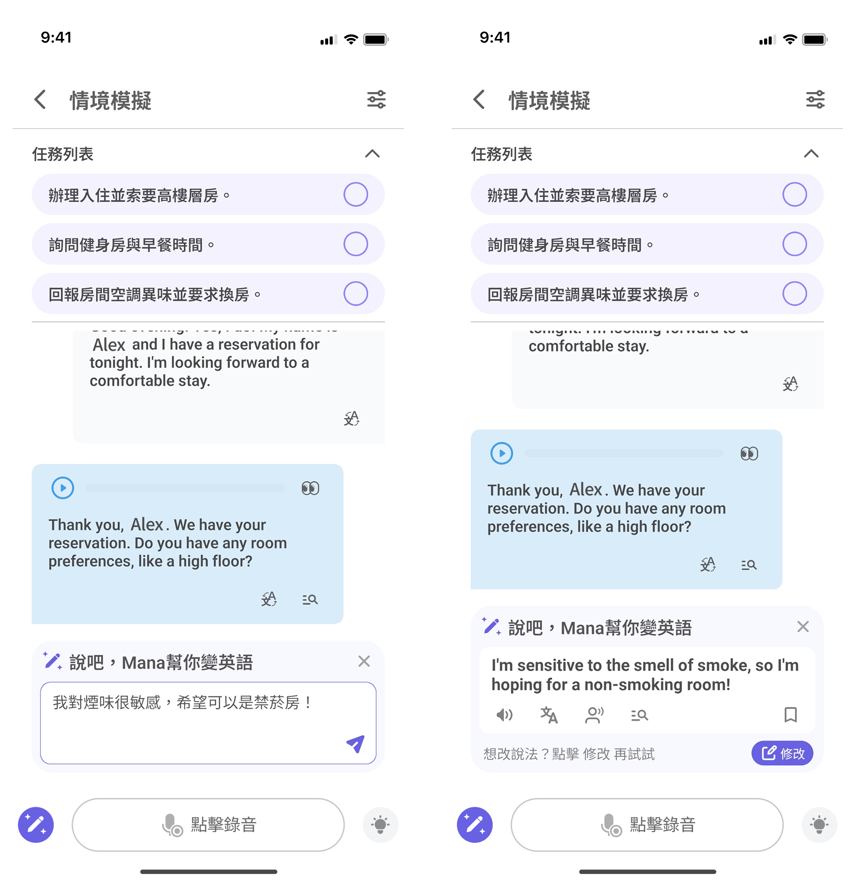 不管是飯店 Check-in、餐廳預約,還是突發的醫藥需求,Mana AI 都能模擬對話。